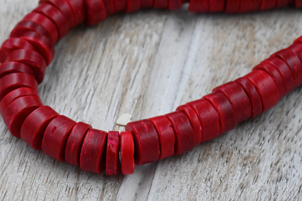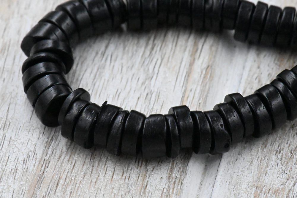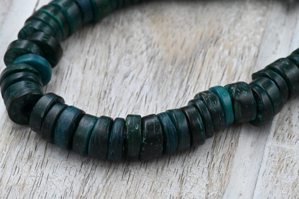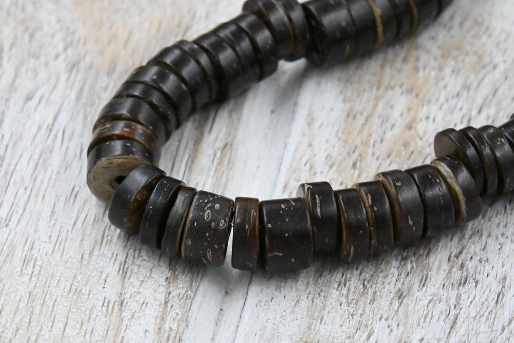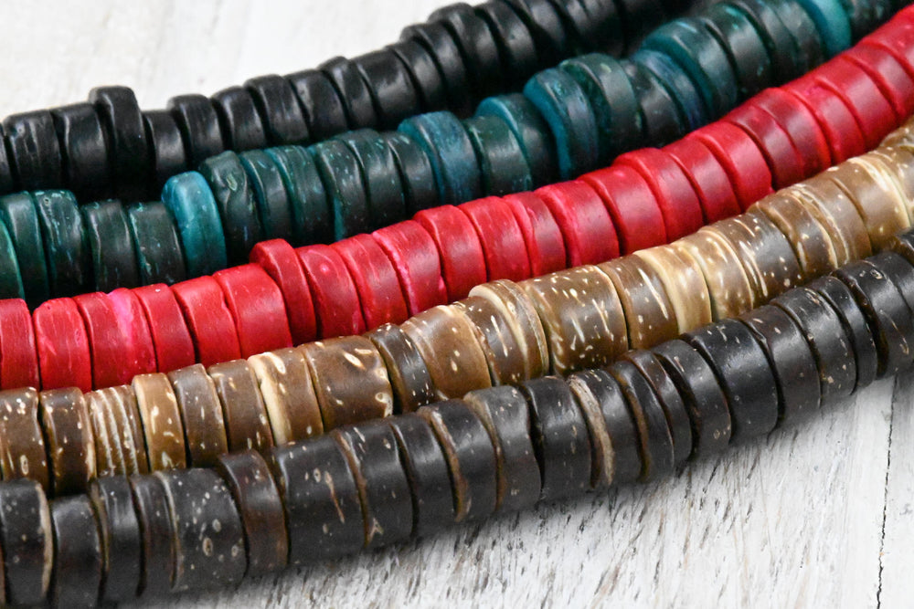 Coconut shell rondelle beads showcase a naturally dyed coconut disc. Each individual bead has an approximate diameter of 9mm and a thickness of 2-6mm, with a hole size of 3mm. Each strand holds a total of 108 beads, providing a unique tropical feel to any jewelry project.