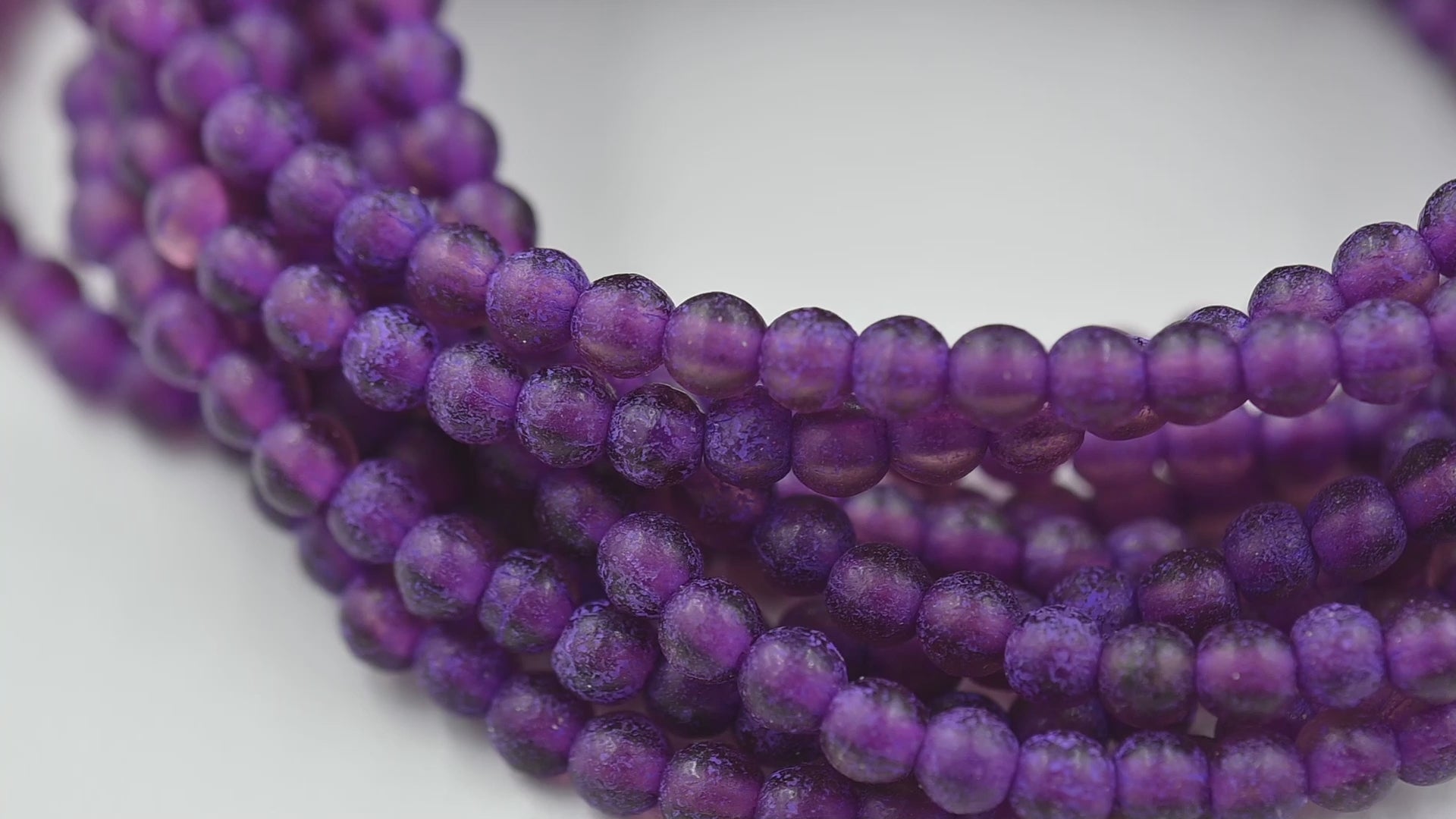 Description: These beads are semi-transparent purple, complemented by a purple wash and an etched finish that lends an irregular appearance to each bead.
